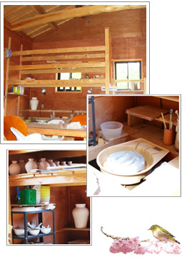 電気窯(主に素焼用に利用)1基・電動ロクロ2台手回しロクロ数台が主な設備です。